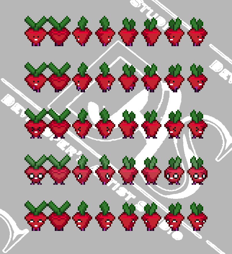 Contains four(4) (16*16 pixel) Vegetable characters with each containing five(5) animations each on all eight(8) angles: